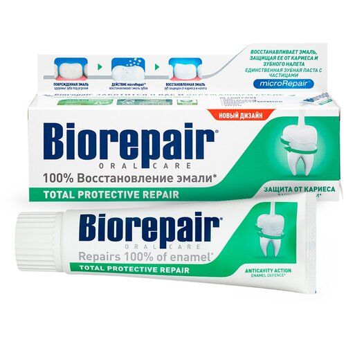 Biorepair Total Protective Repair — комплексная защита зубов и дёсен. В основе пасты — нано-кристаллы Microrepair: вещество, идентичное по составу с эмалью зубов. На поверхности эмали образуются микротрещины, которые приводят к образованию кариеса. Частицы Microrepair проникают в микроповреждения и эффективно восстанавливают эмаль, защищают от образования налёта и зубного камня. Экстракт исландского мха, входящий в состав пасты, уничтожает патогенные бактерии, которые являются причиной кариеса и воспалительных заболеваний дёсен, он имеет мощный противомикробный эффект. Зубная паста Biorepair Total Protective Repair рекомендована для комплексной защиты полости рта и подходит для ежедневного применения. Благодаря антибактериальному действию паста Biorepair Total Protective Repair станет незаменимым помощником людям, использующим брекет-систему. Аллергических реакций в ходе клинических исследований не выявлено.