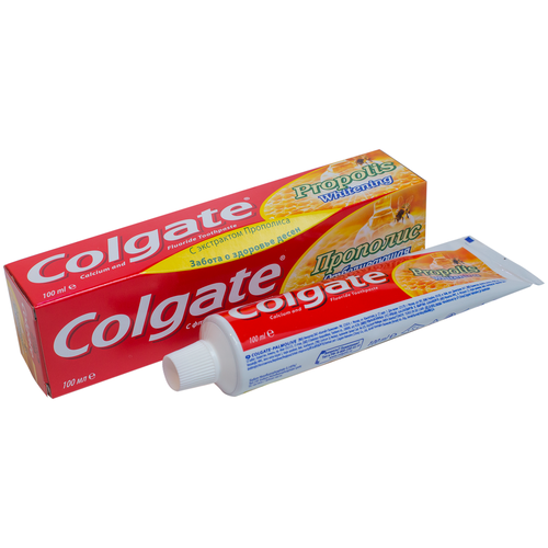 Зубная паста COLGATE прополис отбеливающая. Целебная сила прополиса для эффективной природной защиты полости рта Зубная паста Colgate Прополис Отбеливающая с экстрактом прополиса cочетает в себе кальций, активный фтор, прополис и очищающие микрочастицы, бережно отбеливающие зубы. Прополис известен своими лечебными свойствами. Фтор и кальций необходимы для защиты зубов от кариеса. Зубная паста Colgate Прополис Отбеливающая поможет вам и вашей семье сохранить зубы крепкими, а десны здоровыми.