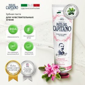 Зубная паста Pasta Del Capitano Sensetive для чувствительных зубов создана специально для снижения чувствительности зубов, в составе содержится Kalident, гидроксиапатит кальция и Potassium Nitrate, нитрат калия. Kalident, уменьшает проблемы, связанные с деминерализацией зубной эмали и зубной эрозией, предотвращает кариес и защищает зубную эмаль и восстанавливает микроскопические повреждения зубной эмали. За счет Kalident происходит реминерализация внутреннего слоя зубной эмали. Potassium Nitrate, в свою очередь, десенситизирует нервы посредством накопления ионов калия, снижает чувствительность нервных окончаний к потенциально болезненным раздражителям. Молекула SULFETAL Zn Сульфат Цинка, замедляет распространение бактерий и микроорганизмов, которые представляют собой зубной налет и последующее преобразование налета в зубной камень. Pasta Del Capitano Sensetive для чувствительных зубов НЕ содержит SLS, триклозан, парабены, формальдегид. Уровень абразивности RDA -10.