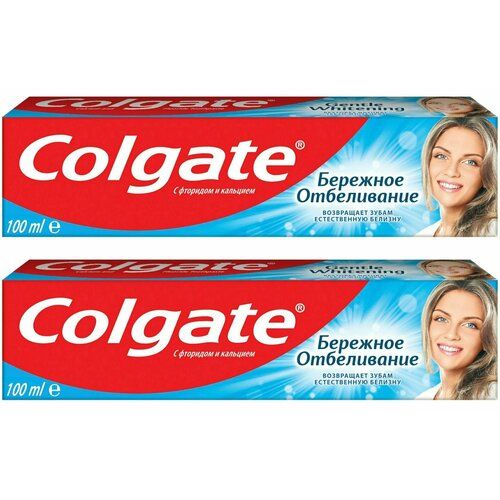 Зубная паста Colgate Бережное Отбеливание 100 мл. х 2 шт. Зубная паста Colgate Бережное Отбеливание удаляет потемнения с поверхности зубов, восстанавливая их естественную белизну, и не повреждает зубную эмаль, а также способствует укреплению эмали зубов и защищает от кариеса.