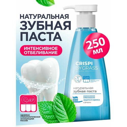 Натуральная отбеливающая зубная паста с фтором CRISPi от Grass 250 мл в форме геля с освежающим мятным вкусом бережно очищает, восстанавливает и укрепляет зубную эмаль, снижает чувствительность зубов. Зубная паста с дозатором Криспи рекомендована людям, страдающим от повышенной чувствительности зубов, тех кто выбирает своевременную заботу о здоровье полости рта. Паста зубная обеспечивает профилактику и лечение нарушений целостности зубной эмали, возникновения кариеса и других заболеваний, возникновения болезненных ощущений при употреблении горячей/холодной, сладкой, кислой пищи, при попадании холодного воздуха. Отбеливающая паста эффективно удаляет налёт от чая, кофе и сигарет, предотвращает образование зубного камня, заботится о состоянии полости рта и свежести зубов. Паста Crispi в новом формате - зубная паста во флаконе с дозатором. Не нужно больше выдавливать пасту, достаточно легко нажать на помпу. Упаковка с помпой поможет экономично расходовать пасту, а большой объём 250 мл делает вашу покупку выгодной, ведь он вмешает в себя больше 3-х обычных тюбиков. Гель быстро растворяется и оптимально пенится. Товары бытовой химии от компании Грасс - это отличный подарок для ваших близких, в подарочном наборе его могут дополнить жидкое мыло , гели для душа , средства для стирки, пятновыводитель, моющие и чистящие средства для дома.