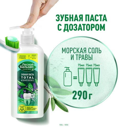 "Для ежедневного ухода за зубами и полостью рта попробуй зубную пасту Лесной Бальзам TOTAL Комплекс для всей семьи Морская соль и травы, в составе которой 95% ингредиентов натурального происхождения*.
