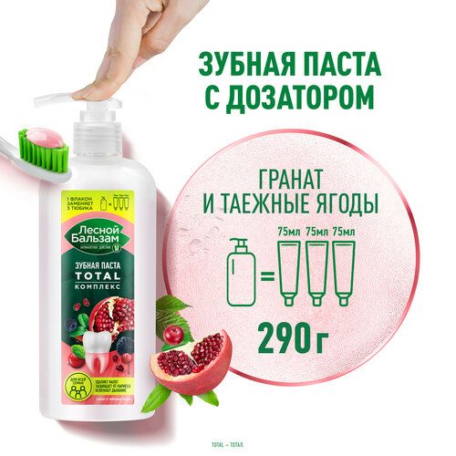 "Для ежедневного ухода за зубами и полостью рта попробуй зубную пасту Лесной бальзам TOTAL Комплекс для всей семьи Гранат и таежные ягоды, в составе которой 95% ингредиентов натурального происхождения*. Увеличенный объем во флаконе с удобным дозатором экономичен в использовании: одного нажатия достаточно для одной чистки зубов. Флакон вмещает в себя 3 тюбика зубной пасты и рассчитан на 4-5 месяцев использования.