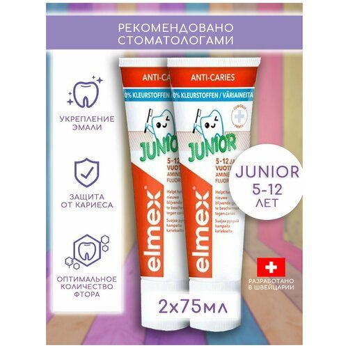 НАЙТИ ВЫГОДНЕЕ - Elmex, зубная паста Junior Юниор детская финская для подростков для детей от 6 до 12 лет от кариеса ежедневная (2 шт х 75 мл)