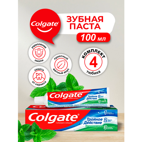 Зубная паста Colgate Тройное Действие Натуральная мята 100 мл. х 4 шт. Зубная паста Colgate Тройное Действие обеспечивает максимальную защиту от кариеса. Эта трехцветная зубная паста оказывает тройное действие: помогает защищать зубы от кариеса, помогает удалять потемнения с поверхности зубов, тем самым делая зубы белее, освежает дыхание. Colgate Тройное Действие обладает приятным мятным вкусом. Также содержит кальций, который способствует глубокому очищению эмали. Защищает зубы от кариеса.