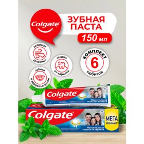 Colgate зубная паста Максимальная Защита от кариеса Свежая мята 150 мл. х 6 шт. Зубная паста Максимальная Защита от кариеса Свежая мята помогает предотвратить потерю минералов и сохранить зубы крепкими изнутри. Удаляет зубной налет, бережно восстанавливает белизну зубов. Уникальная формула с технологией Calcium-lock встраивается в структуру эмали и удерживает кальций в зубах, укрепляя ослабленную эмаль и защищая зубы от кариеса со всех сторон. Приятный мягкий мятный вкус Colgate Максимальная Защита от кариеса Свежая Мята надолго освежит дыхание.