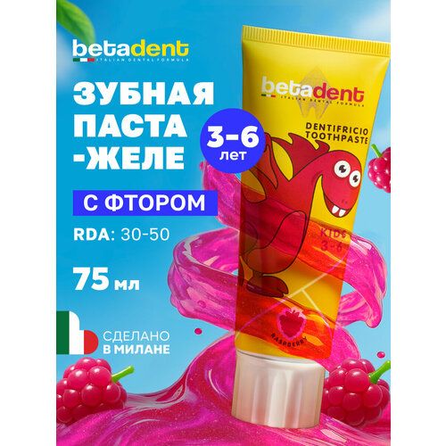 НАЙТИ ВЫГОДНЕЕ - Детская зубная паста гель BETADENT Kids защита от кариеса, вкус Малина, от 3 до 6 лет, с фтором, Бетадент, Италия, 75 мл