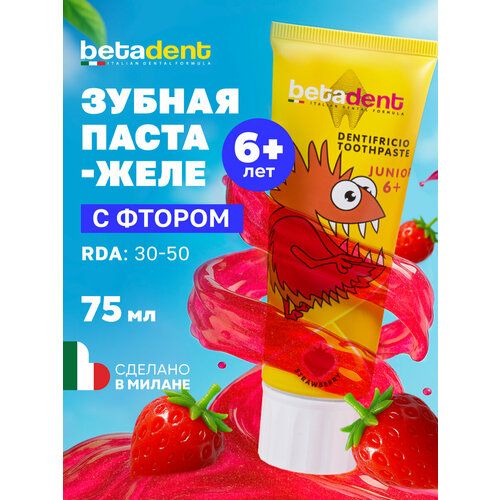 НАЙТИ ВЫГОДНЕЕ - Детская зубная паста гель BETADENT Junior защита от кариеса, вкус Земляника, от 6 лет, с фтором, Бетадент, Италия, 75 мл