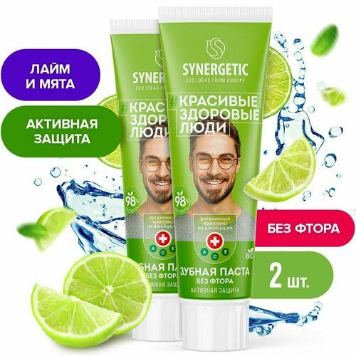 НАЙТИ ВЫГОДНЕЕ - Зубная паста SYNERGETIC Активная защита лайм+мята, натуральная, без фтора 100 гр, 2 шт.