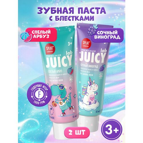 Набор детская комплексная зубная паста SPLAT Juicy Lab с блестками со вкусом спелого арбуза и сочного винограда от 3 лет, комплект из 2 штук.