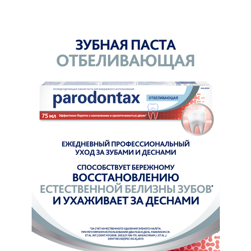 Зубная паста parodontax Отбеливающая бережно и эффективно удаляет зубной налет, восстанавливая естественную белизну зубов, и борется с воспалением и кровоточивостью десен (1).