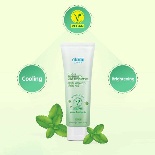 Атоми мятная зубная паста содержит мягкие ингредиенты, которые создают здоровую и освежающую среды для полости рта. Atomy веганская зубная паста с невероятно прохладным и освежающим ощущением. Паста является веганским сертифицированным продуктом. Преимущество: 1) Предотвращает кариес и зубной камень. 2) Охлаждение и освежение. 3) Эффект осветления. Объем: 150 г. Рекомендуется использовать от 6 лет и старше. При использовании детьми в возрасте до 6 лет используйте небольшое количество зубной пасты размером примерно с горошину за раз и используйте под руководством взрослых, чтобы избежать сосания или глотания пасты.