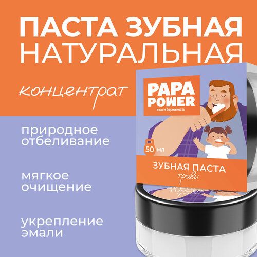 Зубная паста "PAPA Power" объемом 50 мл представляет собой натуральный продукт, созданный для комплексного ухода за полостью рта.