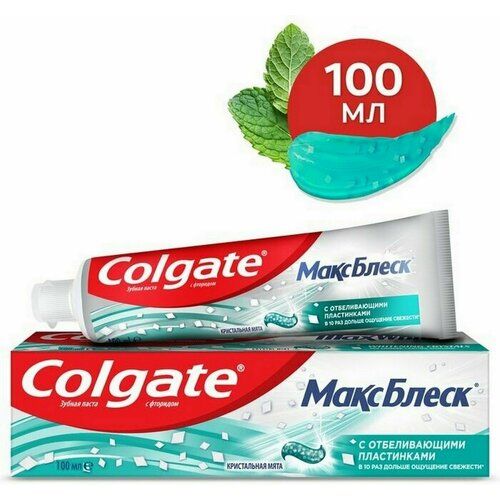 Отбеливающая зубная паста Colgate Макс Блеск не только сделает ваши зубы белее, но и подарит невероятное ощущение свежести для еще большей уверенности в себе. 1. Отбеливает зубы — благодаря отбеливающим пластинкам в составе. 2. Освежает дыхание — экстраосвежающая формула с передовой технологией интенсивно охлаждает, устраняет неприятный запах и дарит ощущение невероятной свежести. В 10 раз дольше ощущение свежести по сравнению с другими зубными пастами Colgate с фторидом. 3. Помогает бороться с кариесом 4. Приятный вкус мяты Рекомендовано: - для всей семьи - для ежедневного ухода - для профилактики кариеса - для устранения налета - для борьбы с неприятным запахом изо рта Текстура: голубой гель с белыми пластинками. Пластинки растворяются во время чистки зубов. Объем: 100 мл
