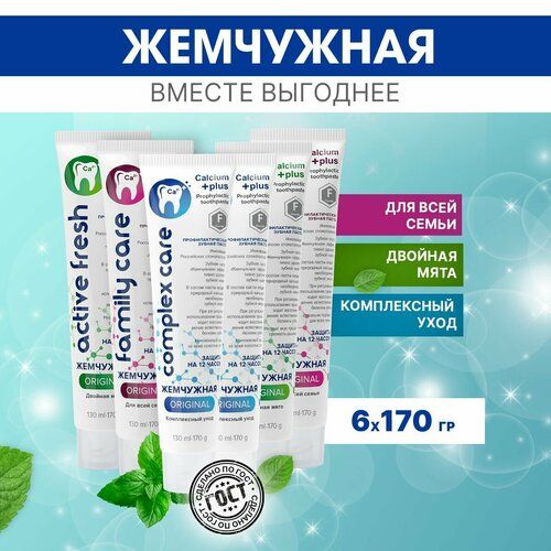 НАЙТИ ВЫГОДНЕЕ - Набор зубных паст Жемчужная 6 штукт по 170 гр Комплексный уход х2, Двойная мята х2, Для всей семьи х2