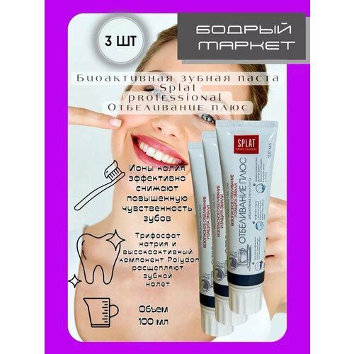 Комплект 3шт. Зубная паста SPLAT «Отбеливание Плюс» со фтором ухаживает за зубами и безопасно отбеливает их благодаря уникальному чистящему комплексу Sp.White System. Натуральный фермент папаин и высокомолекулярный компонент полидон эффективно расщепляют налет, способствуют сохранению белизны. Ионы калия снижают повышенную чувствительность зубов. Фторид-ионы эффективно защищают от кариеса. Клинически доказанная эффективность за 4 недели применения:- Отбеливающий эффект – 1,5 оттенка по шкале VITAPAN.- Очищающий эффект – 50%.- Реминерализующий эффект – 40%.- Кровоостанавливающий эффект – 50,2%. Состав: Вода, гидрогенизированный гидролизат крахмала, диоксид кремния, нитрат калия, дикальцийфосфат дигидрат, пирофосфат кальция, трифосфат натрия, ароматизатор, кокосульфат натрия, целлюлозная камедь, монофторфосфат натрия, лаурилсаркозинат натрия, ПВП, метилпарабен натрия, сахарин натрия, ментол, папаин, лимонен. Зубная паста отбеливающая для чувствительных зубов натуральная защита эмали от кариеса 100мл. Мечтаете о белоснежной улыбке? Сплат разработал особую формулу, которая предназначена для безопасного и деликатного отбеливания даже чувствительных зубов Паста от налета рекомендована к применению взрослым и детям с 14 лет.