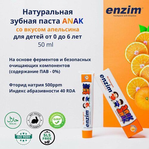 НАЙТИ ВЫГОДНЕЕ - ENZIM Зубная паста Anak со вкусом апельсина для детей 0-6 лет 63г (50мл) / Энзимная (Ферментная), с фтором, с ксилитом