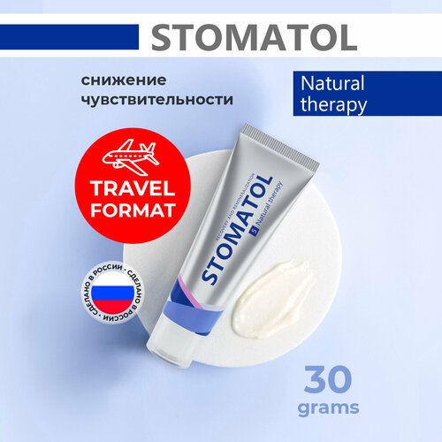 Зубная паста для снижения чувствительности зубов и десен с гидролатами STOMATOL Natural therapy 30 грамм способствует снижению чувствительности зубной эмали, обладает противовоспалительным действием, подавляя активность бактерий, уменьшая кровоточивость десен. Натуральная зубная паста на 97,4% состоит из ингредиентов натурального происхождения, уникальная формула с гидролатом нероли и гиалуроновой кислотой, которые способствуют увлажнению и смягчению слизистой оболочки полости рта. Бережное очищение эмали происходит за счет комбинации абразивов – диоксида кремния, который мягко полирует эмаль, не повреждая ее, и дикальцийфосфат дигидрата, который регулирует PH и выполняет минерализующую функцию за счет ионов кальция и фосфора. Регенерирующая зубная паста с природными противовоспалительными компонентами, предотвращает появление кариеса и воспалений в ротовой полости. Зубная паста против кариеса проникает в микротрещины, восстанавливает поврежденную эмаль, тем самым минерализуя и укрепляя зубы. Зубная паста отбеливающая укрепляет стенки капилляров в ротовой полости и эффективен для десен. Профилактическая зубная паста для чувствительных зубов подойдет для ежедневного ухода за полостью рта. Зубная паста подходит для брекетов. Очищающая зубная паста оказывает укрепляющий эффект, способствует интенсивному восстановлению зубной эмали (реминерализация), удалению налета, возвращает здоровье и красоту зубам и свежесть дыханию. Антибактериальная паста является прекрасной профилактикой кариеса. Travel-формат зубной пасты удобно брать с собой в путешествия, самолет, поезд, поездки и просто носить с собой в сумочке, чтобы всегда быть готовым к приключениям