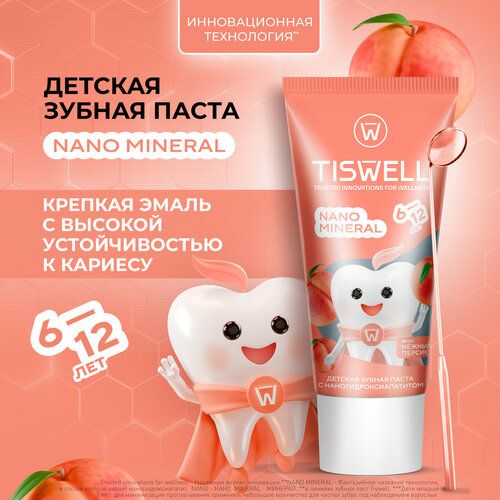 НАЙТИ ВЫГОДНЕЕ - Зубная паста Tiswell детская реминерализующая от кариеса и налета с наногидроксиапатитом и фтором Нежный персик от 6–12 лет 60 г