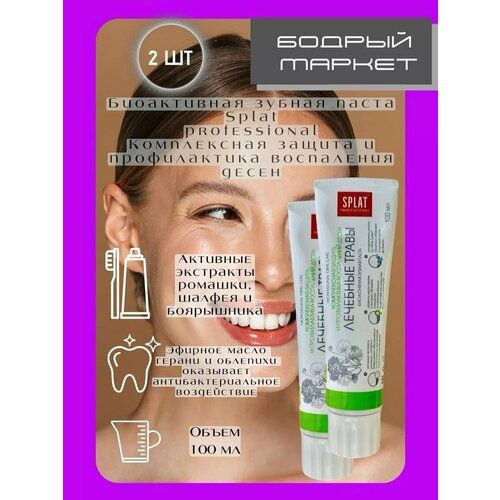 Комплект 2шт. Гелевая зубная паста натуральная от воспаления десен Лечебные травы, 100 мл." Уважаемые покупатели кальцис, полученный из яичной скорлупы, укрепляет эмаль и защищает от кариеса. Профессиональная натуральная паста содержит эфирное масло герани, которое обладает обезболивающим свойством и благоприятно влияет на эмоциональное состояние. Лечебная зубная паста изумрудного цвета. Наш набор для ухода за зубами содержит экстракт облепихи, который заживляет мягкие ткани. Ионы укрепляют эмаль зубов и делают ее устойчивой к кислотам. Необходимо следить за здоровьем полости рта, чтобы бывать в кабинете у стоматолога только на профилактических осмотрах. Начните использовать гелевую пасту в тубе для полости рта, она оказывает тонизирующее действие на десны, способствует улучшению процесса заживления и регенерации. Паста от налета подойдет для взрослых и детей. А также средство – отличный подарок для близких. Можно взять для путешествий. С уважением к Вам, SPLAT, выбирайте и берегите здоровье