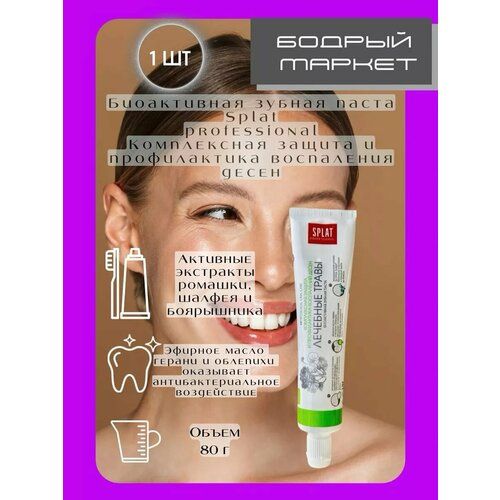 Гелевая зубная паста натуральная от воспаления десен Лечебные травы, 80г. Уважаемые покупатели кальцис, полученный из яичной скорлупы, укрепляет эмаль и защищает от кариеса. Профессиональная натуральная паста содержит эфирное масло герани, которое обладает обезболивающим свойством и благоприятно влияет на эмоциональное состояние. Лечебная зубная паста изумрудного цвета. Наш набор для ухода за зубами содержит экстракт облепихи, который заживляет мягкие ткани. Ионы укрепляют эмаль зубов и делают ее устойчивой к кислотам. Необходимо следить за здоровьем полости рта, чтобы бывать в кабинете у стоматолога только на профилактических осмотрах. Начните использовать гелевую пасту в тубе для полости рта, она оказывает тонизирующее действие на десны, способствует улучшению процесса заживления и регенерации. Паста от налета подойдет для взрослых и детей. А также средство – отличный подарок для близких. Можно взять для путешествий. С уважением к Вам, SPLAT, выбирайте и берегите здоровье