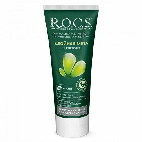 Паста для зубов R. O. C. S. «Энергия утра» («Двойная Мята») имеет в своем составе запатентованный комплекс активных микроэлементов, которые оказывают благотворное воздействие на различные обменные процессы и ткани ротовой полости: