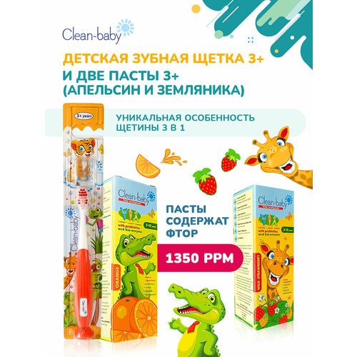 Набор детские зубные пасты Clean-baby с пробиотиками и ферментами + детская зубная щетка 3+