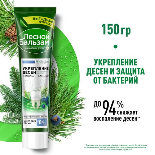 Профилактическая зубная паста Лесной бальзам обладает иммуноактивным действием и заботится о здоровье десен. Рекомендована для ежедневного использованию при появлении кровоточивости при чистке зубов, для ухода за ослабленными деснами, склонными к появлению локальных очагов воспаления.Как возникают проблемы с деснами? Некачественное очищение зубов приводит к скоплению бактериального налета, который трансформируется в зубной камень и постепенно начинает травмировать десну и вызывать кровоточивость. Предотвратить образование зубного камня, укрепить десны и уменьшить их кровоточивость поможет серия Лесной бальзам.Формула зубной пасты на 95% состоит из ингредиентов натурального происхождения, усилена экстрактом коры дуба, ягод можжевельника и хвойными смолами. Такой сбалансированный состав способствует укреплению десен, улучшает кровообращение и питание в мягких тканях полости рта, препятствует повторному возникновению кровоточивости при чистке зубов. Хвойные смолы обладают высокими антибактериальными свойствами и защищают от развития воспаления.Клинически доказанный результат: