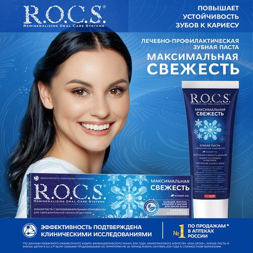 Зубная паста R.O.C.S. Максимальная свежесть содержит уникальный ароматизатор, который обладает замедленной ферментацией, сохраняя свежесть полости рта даже после приема пищи. Паста позволяет надолго сохранить свежесть дыхания, ощущение чистоты и гладкости зубной эмали. В составе зубной пасты R.O.C.S. Максимальная свежесть включен активный минеральный комплекс, состоящий из кальция, фосфора, магния и кремния. Он сбалансирован и имеет высокую степень усвояемости. Развитию в ротовой полости патогенной микрофлоры препятствует ксилитол (6%), он интенсивно удаляет налет и восстанавливает баланс полезной микрофлоры. Низкая абразивность пасты позволяет использовать ее и при повышенной чувствительности зубов.