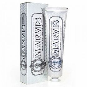 Кремообразная низкоабразивная зубная паста Марвис предназначена для тщательной очистки эмали от налёта, а также для мягкого отбеливания и устранения всех причин неприятного запаха изо рта. В составе пасты содержится фтор для активной профилактики появления кариеса. Фтор способствует реминерализации и укреплению зубной эмали, одновременно уничтожая вредные микробы, способствующие появлению и развитию кариеса. Абразивы — гидроксид алюминия и диоксид кремния — тщательно очищают образовавшийся налёт и полируют эмаль, не повреждая её. Компоненты пасты, входящие в состав, позволяют быстро и эффективно отбелить эмаль от пятен и потемнений, что делает её незаменимым средством для курильщиков и любителей кофе. Паста MARVIS рекомендуется для ежедневного использования и подходит при наличии чувствительности. Паста содержит фторид в концентрации 0.20%.