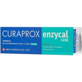 CURAPROX Enzycal эффективно выполняет гигиеническую функцию: борется с налетом без использования абразивных и вредных компонентов. Мягкая зубная паста против кариеса для ежедневного использования с минимально допустимым содержанием фторида натрия 1450 ppm. Мягкая формула не содержит лаурилсульфат натрия, значительно снижая риск возникновения афтозных язв. Enzycal содержит 3 важных фермента, которые усиливают антибактериальные свойства слюны, задерживают рост бактерий. Отлично подходит для использования с ультразвуковыми щетками.