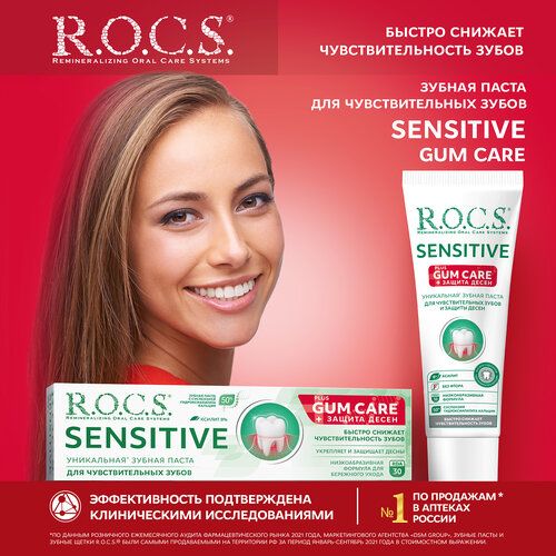 Лечебно-профилактическая зубная паста R.O.C.S.® «Plus GUM CARE» разработана для ежедневной гигиены полости рта для людей, страдающих от повышенной чувствительности зубов и дёсен. Уникальная формула с низкоабразивными частицами деликатно и эффективно удаляет зубной налет, укрепляет эмаль, насыщая ее необходимыми минералами, снимает симптомы чувствительности зубов, существенно улучшает состояние десен и слизистых ротовой полости. Эффект заметен после первого применения. Паста имеет низкую абразивность (RDA=30), качественно удаляет зубной налет и полностью рекомендована для регулярного ежедневного использования.