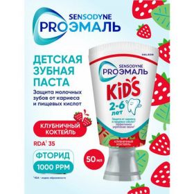 Детская зубная паста Sensodyne Proэмаль Kids со вкусом "Клубничный коктейль" обеспечивает правильное созревание эмали(1), 24 часа борется с кариесом (2).