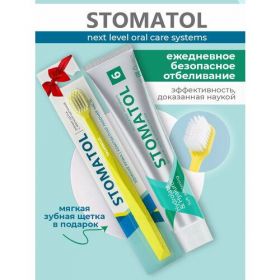Зубная паста Стоматол + зубная щетка с мягкой щетиной в подарок. Зубная паста отбеливающая STOMATOL Soft whitening идеальный вариант для безопасного и эффективного отбеливания. Натуральная зубная паста на 97,7% состоит из ингредиентов натурального происхождения, органическая зубная паста усилена гидролатом чайного дерева, который обладает мягким осветляющим эффектом, снимает воспаление. Гиалуроновая кислота способствует увлажнению и смягчению слизистой оболочки полости рта. Натуральные экстракты, бисаболол и масла оказывают противовоспалительное, смягчающее, увлажняющее действие. Бережное очищение эмали происходит за счет комбинации абразивов – диоксида кремния, который мягко полирует эмаль, не повреждая ее, и дикальцийфосфат дигидрата, который регулирует PH и выполняет минерализующую функцию за счет ионов кальция и фосфора. Содержит специальный комплекс микроэлементов, укрепляющих зубную эмаль и являющихся надёжной защитой от кариеса. Зубные пасты совмещают ежедневный уход и профилактику с мягким отбеливанием при условии регулярного двухразового использования утром и вечером. Ультракомплекс активных элементов в составе пасты обеспечивает защиту зубов и десен, быстро и эффективно уничтожает налет и бактерии, которые являются источником неприятного запаха. Эффективная зубная паста с безопасным органическим составом, сохранением свежести и мятного аромата на протяжении длительного времени. Зубные щётки STOMATOL разработаны для профессионального ухода за полоcтью рта. Плотность и качество щетины позволяют превосходно очищать поверхность зубов и придесневую зону, не травмируя при этом эмаль. Мягкая двухуровневая щетина адаптируется к контуру каждого зуба. Длинные, более тонкие щетинки легко очищают межзубное пространство, удаляют налет и полируют эмаль. Короткие щетинки эффективно очищают поверхность зубов, в том числе на уровне десен. Компактная головка щетки отлично очищает даже труднодоступные места. Удобная эргономичная ручка позволяет сохранять правильную технику чистки зубов. Зубная щетка с мягкой щетиной STOMATOL SOFT имеет 2250 щетинок, подходит для ухода за чувствительными зубами и деснами.