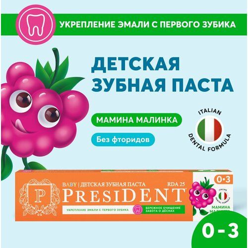 НАЙТИ ВЫГОДНЕЕ - Зубная паста PRESIDENT детская Мамина Малинка от 0 до 3 лет, RDA 25, для укрепления эмали