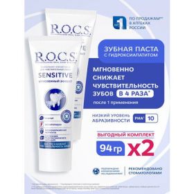 ROCS зубная паста SENSITIVE мгновен эффект 94,0Бренд R.O.C.S. - продукция марки, созданная в современной лаборатории, производится из сырья самого высокого качества. ROCS зубная паста SENSITIVE мгновенный эффект - для чувствительных зубов, бережное отбеливание и насыщение эмали минераламиВнешний вид и свойства: Паста отличается умеренной пенностью, имеет приятный вкус. Хорошо освежает дыхание, но не оставляет долгого послевкусия. Здоровая белизна улыбки и повышенная чувствительность зубов - понятия, считавшиеся несовместимыми даже в современной стоматологии. Согласно статистике, более 70 % взрослого населения мира страдают от гиперчувствительности зубной эмали и дентина. Эти проблемы приводят к неизбежным болезненным ощущениям во время употребления горячей и холодной пищи, сладостей, продуктов, содержащих кислоты и т. д. В таких условиях профессиональное отбеливание, а также, использование отбеливающих паст, порошков и других подобных составов просто не допустимо. Данная зубная паста имеет низкоабразивную формулу для бережного ухода (RDA=30). За счет этого паста не царапает, не повреждает эмаль и дентин. Принципиальным отличием ее состава является кальция гидроксиапатит, синтезированный предприятием-производителем по уникальной запатентованной технологии. Чем выше будет абразивность пасты - тем лучше она будет счищать с поверхности эмали бактериальный и пигментный налет. Коэффициент абразивности паст измеряется индексом «RDA» (RDA - Relative dentin abrasivity), но к сожалению далеко не все производители указывают его на упаковке. Поэтому лучше доверять тем пастам, на которых он указан. Высокая быстрота и результативность использования зубной пасты R. O. C. S. SENSITIVE «Мгновенный Эффект» достигается за счет трех направлений воздействия:• моментального запечатывания мелких дефектов эмали и канальцев незащищенного дентина, обеспечивая снижение чувствительности зубов;• минерального восстановления естественных (собственных) структур зуба благодаря высокой биологической доступности кал