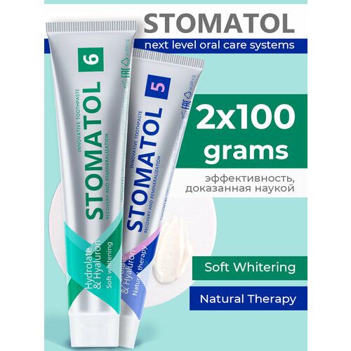 НАЙТИ ВЫГОДНЕЕ - STOMATOL Зубные пасты Soft Whitening 6 безопасное отбеливание + Natural Therapy 5 для здоровья десен, 2 штуки по 100 грамм