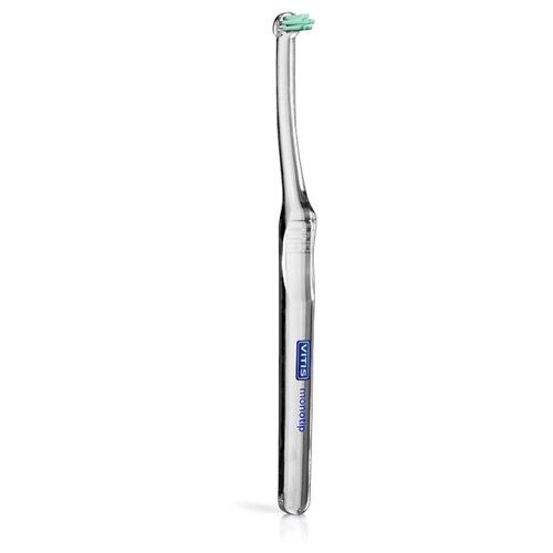 Зубная щетка VITIS Monotip, жесткая. Монопучковая. Для чистки узких промежутков между элементами ортодонтических конструкций и труднодоступных мест. Цвет: прозрачный. Vitis Monotip - монопучковая зубная щётка в мягкой упаковке, созданная испанским производителем специально для очищения труднодоступных участков полости рта. Врачи рекомендуют использовать аксессуар в период ортодонтического лечения, когда гигиена затруднена (в связи с ношением кап, эластиков, цепочек, расширителей, элайнеров или других конструкций. Жесткие щетинки буквально «выметают» бактерии, частицы пищи, а также налет с участков, расположенных между зубами, рядом с замочками брекетов, под силиконовыми или металлическими цепочками, в «десневых карманах», под дугой и многих других. Чтобы снизить риск травмирования десен и слизистых, испанский производитель предусмотрел специальную закругленную конструкцию щетинок. Это позволяет использовать зубную щетку даже при чувствительных деснах (но предварительно лучше проконсультироваться с доктором).