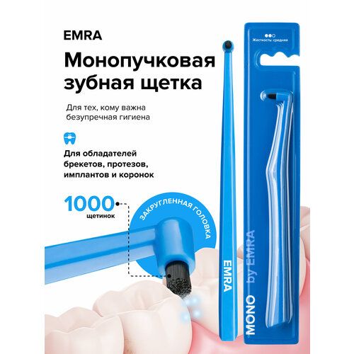 Монопучковая щетка синего цвета MONO by EMRA – это профессиональный инструмент для ухода за полостью рта, который проникает в самые труднодоступные места и обеспечивает безупречную чистоту.