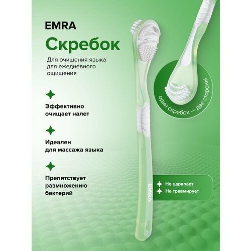 Щетка-скребок для языка от EMRA - это лучший помощник по обеспечению полной гигиены полости рта. На языке так же скапливается большое количество бактерий. Щетка для чистки языка устраняет налет, вызывающий неприятный запах изо рта, и надолго освежает дыхание.