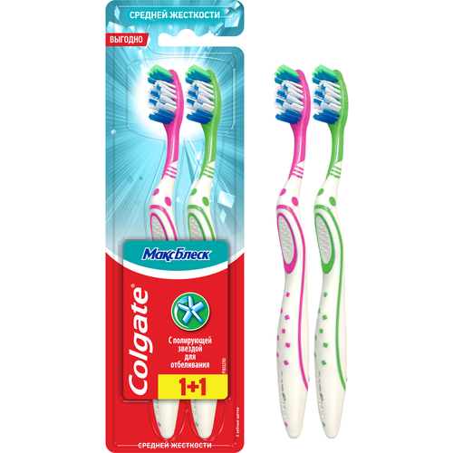 НАЙТИ ВЫГОДНЕЕ - Зубная щетка Colgate Макс Блеск отбеливающая, средней жесткости, в ассортименте, 2 шт.